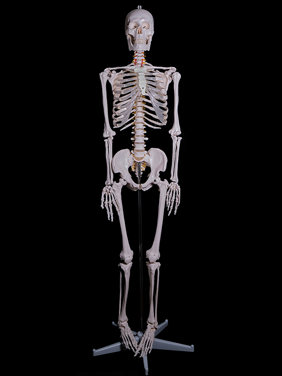 Кости выполнены в соответствии со строением скелета человека, и изготовлены из жесткого пластика белого (или светло-желтого) цвета. Крышка черепа съемная. Нижняя челюсть черепа подвижная, на пружинках. Верхние и нижние конечности легко съемные. Для сохранности при транспортировке конечности сняты. Скелету придана естественная поза стоящего человека. Позвоночник негнущийся. Ребра, тазовые кости и череп жестко соединены с позвоночником. Конечности присоединяются на шарнирах. Скелет устанавливается на хромированную стойку на пластиковой подставке